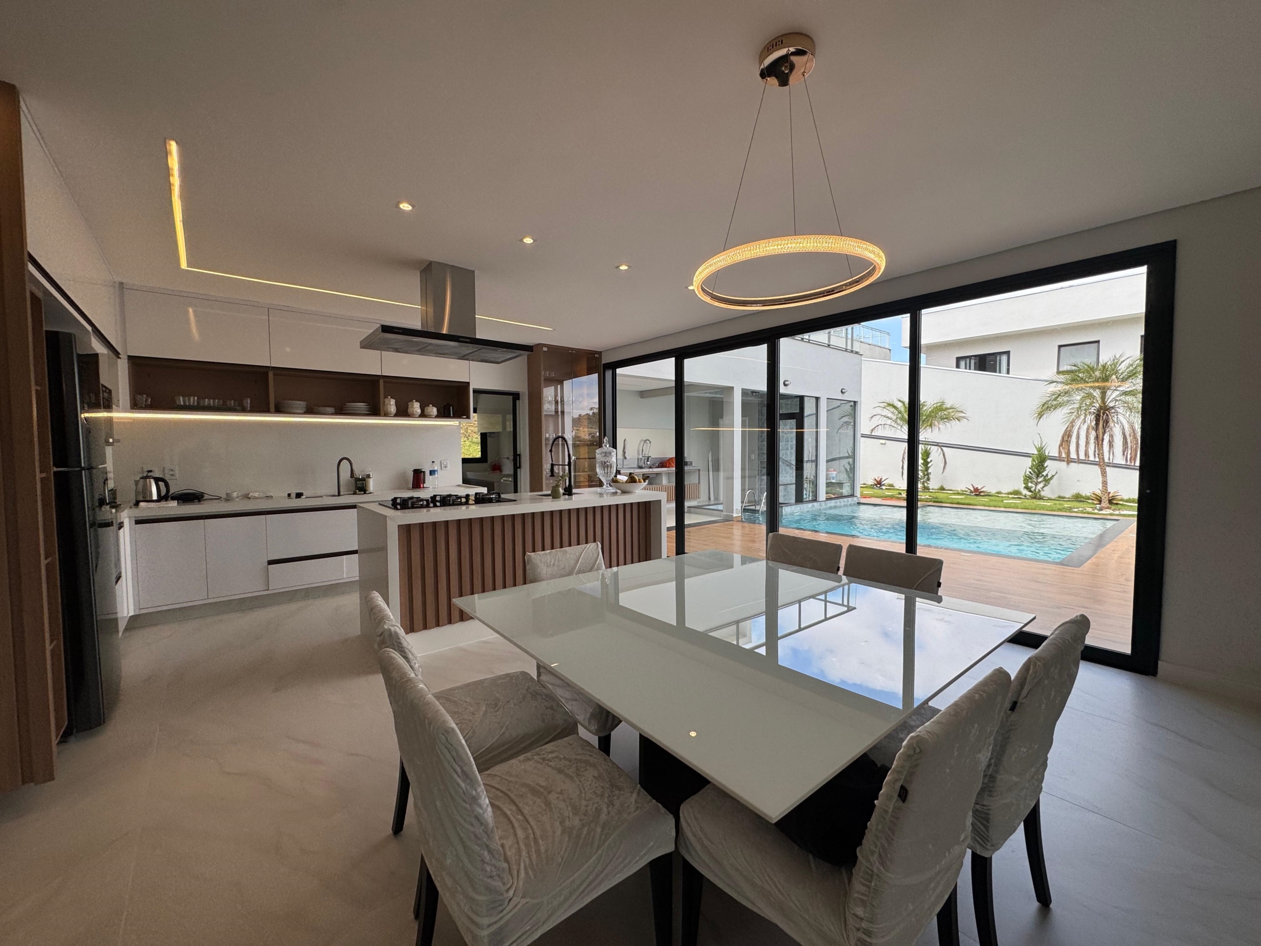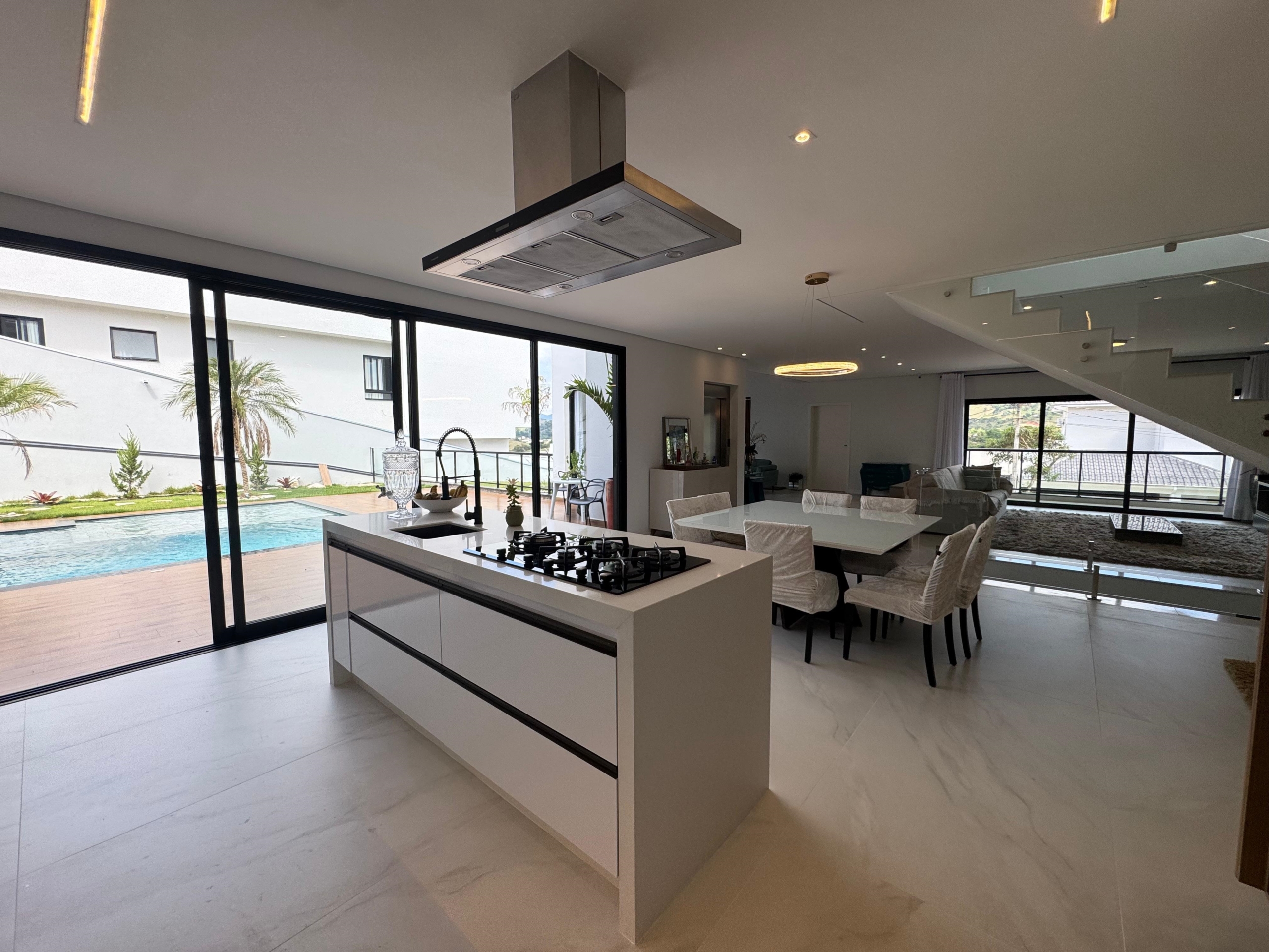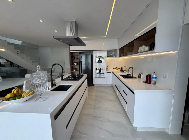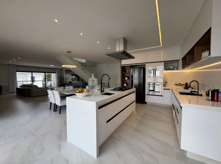 -Cozinha moderna com ilha central, em ambiente aberto, integrada a copa e ao living